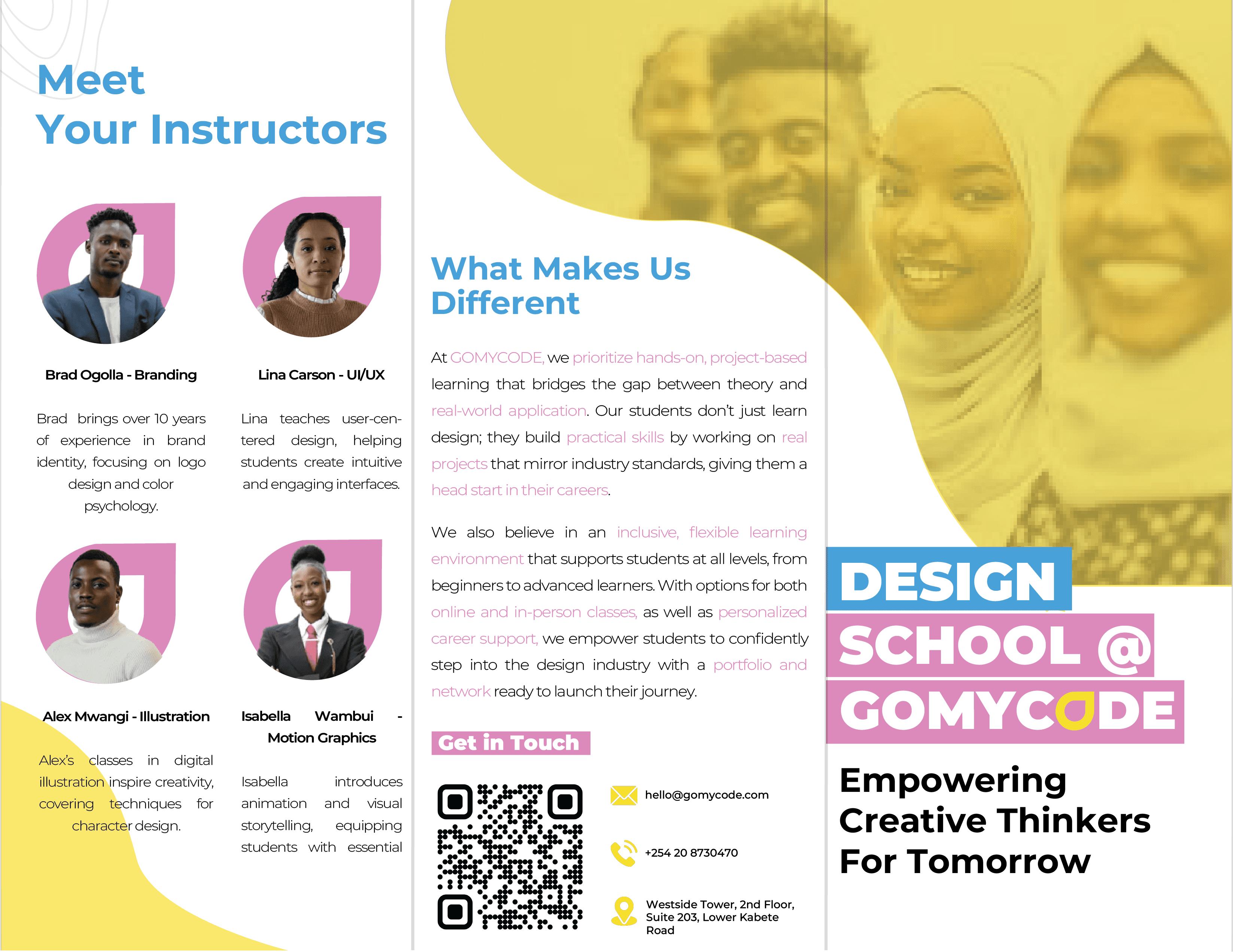 The Design School at GOMYCODE brochure is a testament to the power of combining thoughtful design with strategic branding. Its vibrant visuals, user-friendly layout, and attention to detail make it an ideal promotional tool for inspiring creative thinkers and attracting future students.