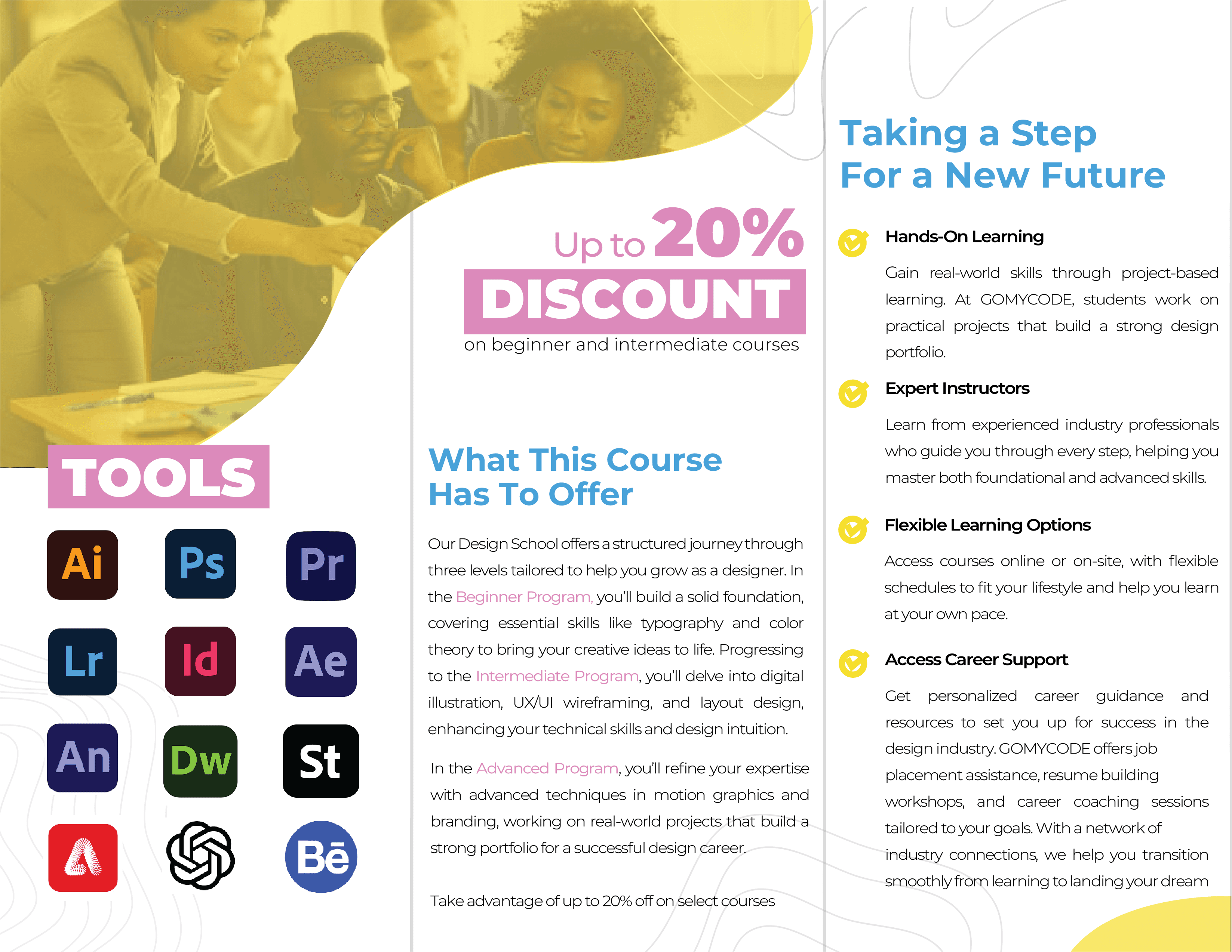 The GOMYCODE Design School brochure was crafted to showcase the institution’s dedication to empowering creative thinkers. Featuring a modern layout, bold colors, and a clear message, the design captures the essence of innovation and education.