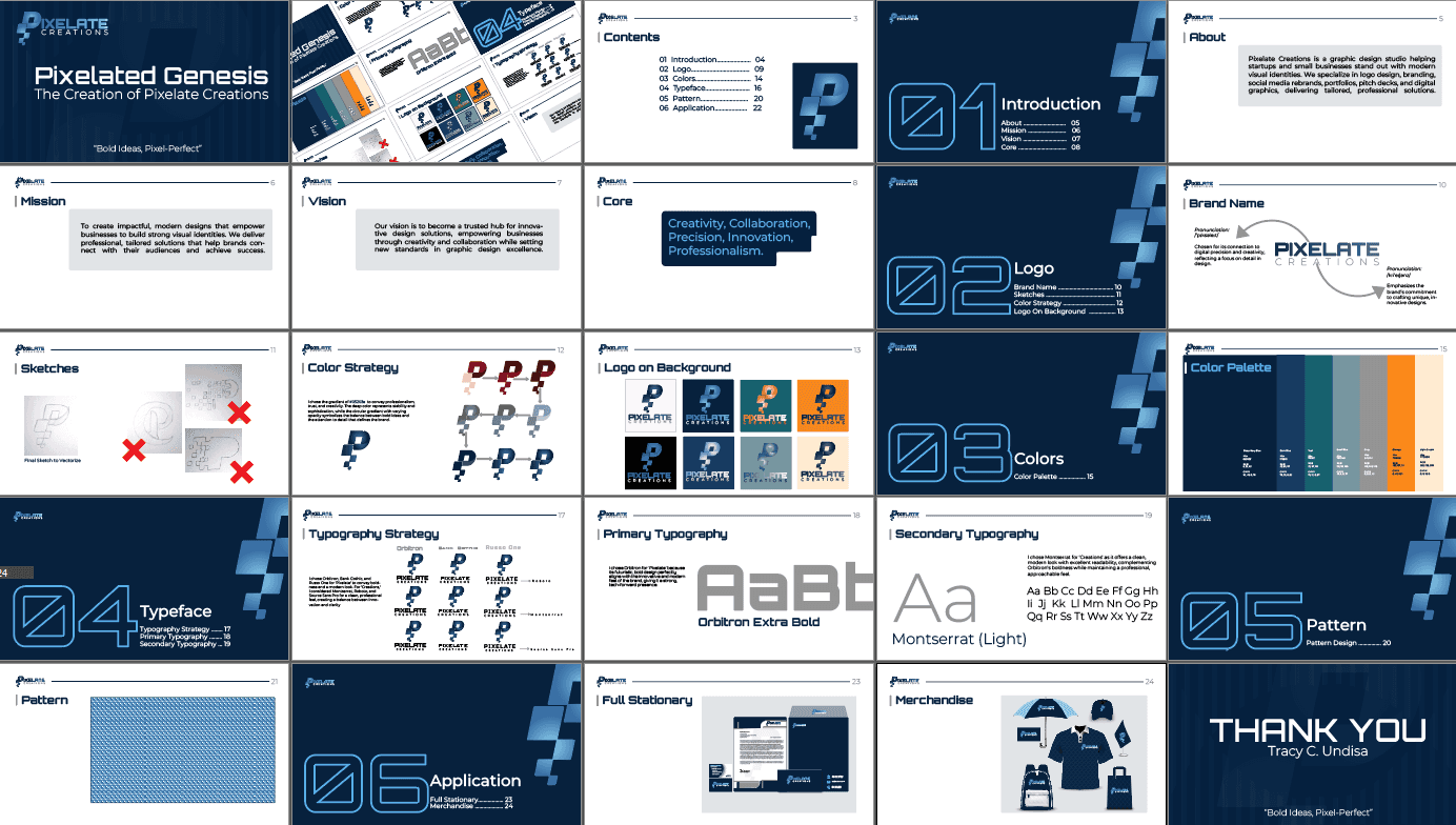 The concept behind Pixelated Genesis was to document and present the creation of Pixelate Creations as a graphic design brand. The project aimed to highlight the meticulous process of crafting a logo, selecting typography, and building a cohesive visual identity, all while embracing creativity and precision.